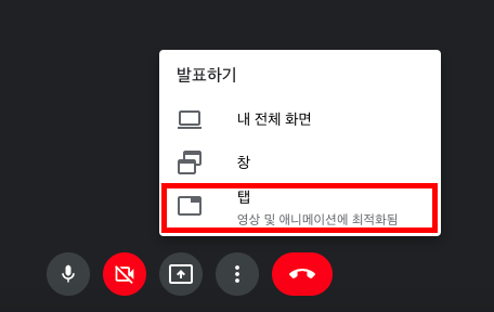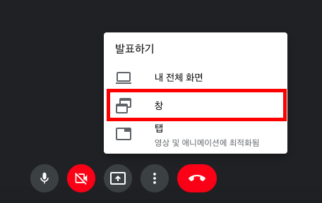 [발표하기] 칸이 나오며 내 전체 화면 / 창 / 탭이 나오는데