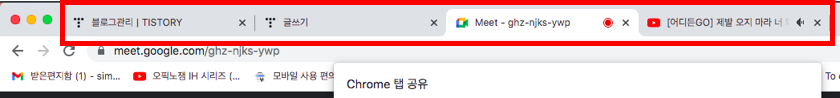 [탭은] 아래 2번째 사진처럼 웹에 여러 개의 페이지 중에 구글미트에 보여줄 화면을 선택하는 겁니다.