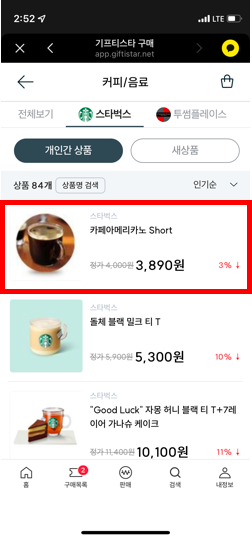 저는 가는 스타벅스를 예시로 들면 [스타벅스]를 누르면 다양한 기프티콘들이 나와요.