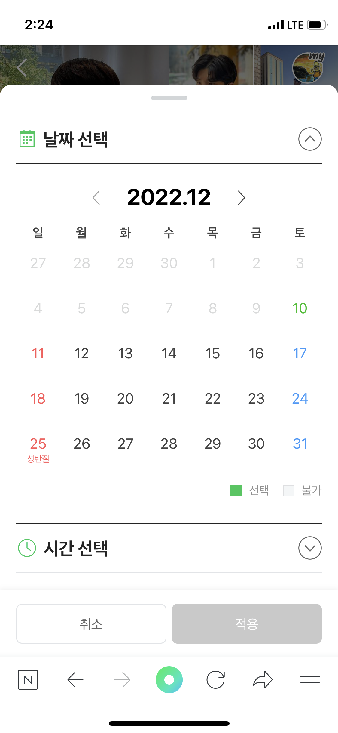 원하시는 미용실을 누르셨다면 첫 번째 사진처럼 예약 날짜와 예약시간을 선택해주세요.