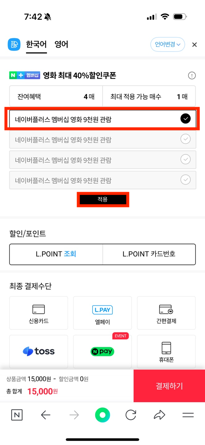 - 쿠폰에서 '네이버플러스 멤버십 영화 9천원 관람' 선택 후 적용 클릭