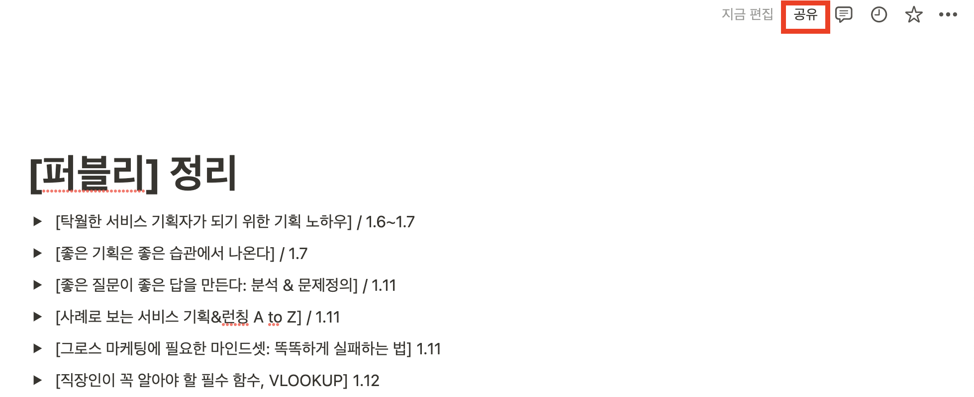 먼저 노션을 켜신 후, 공유하려는 페이지에서 오른쪽 상단에 있는 [공유] 버튼을 눌러주세요.