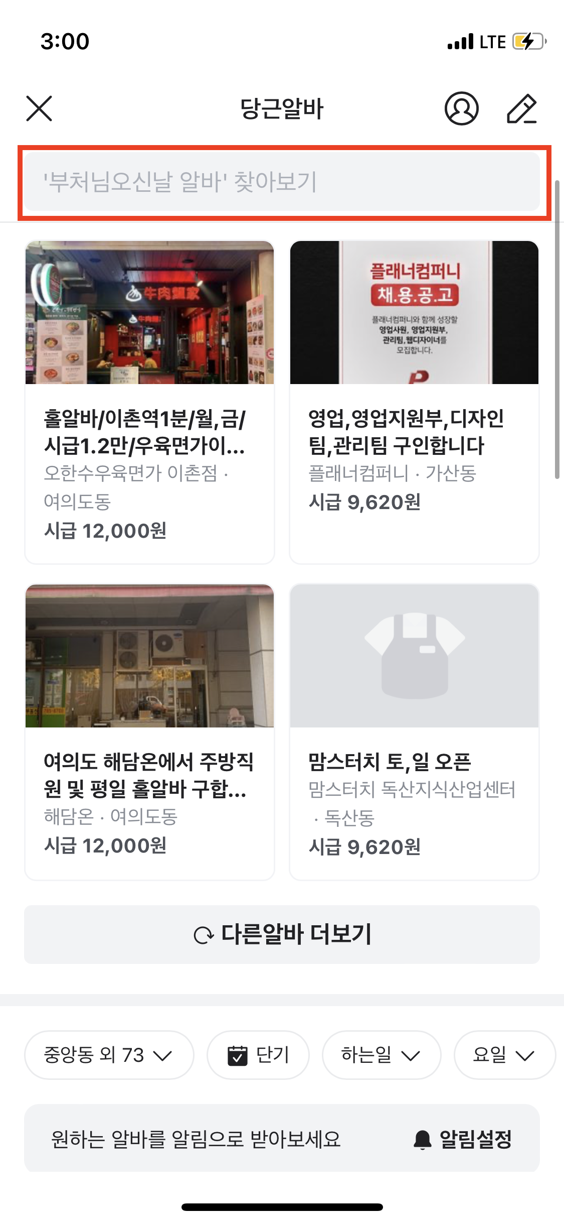 먼저 상단 검색바에서 자신이 원하는 알바 유형을 검색하거나,