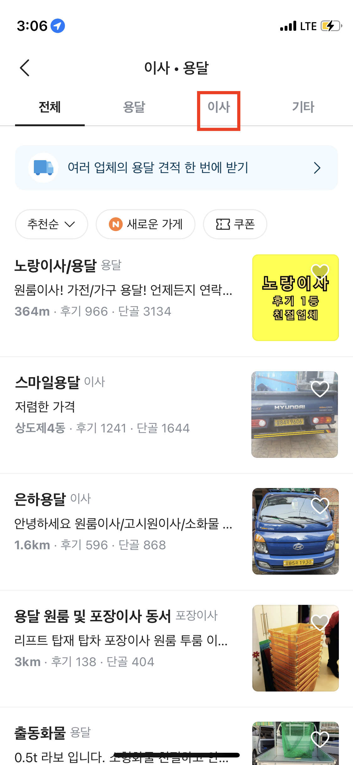 [이사/용달] 카테고리를 통해 들어오셨다면, 상단에 [이사]를 눌러주세요.