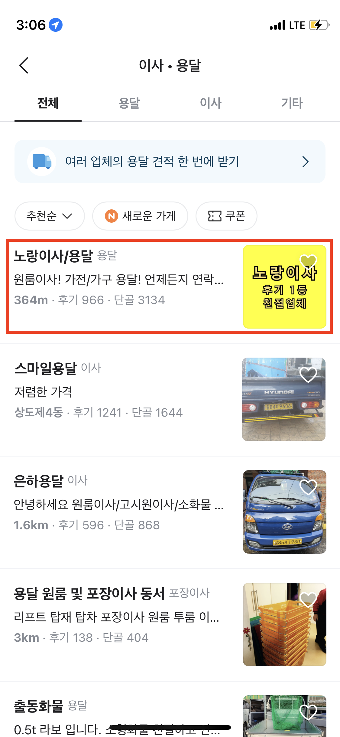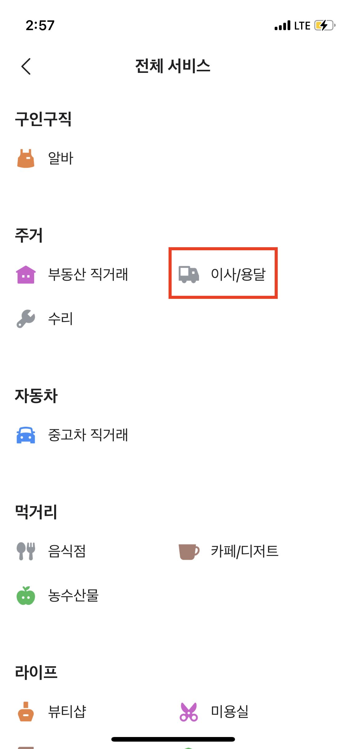 밑으로 조금 내리다 보면 [이사/용달]이란 카테고리가 있는데 클릭해 주세요