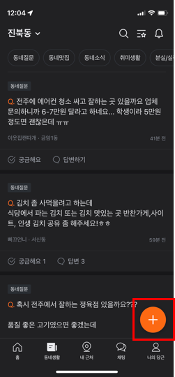 동네생활 글쓰는 방법은 첫 번째 사진 오른쪽 하단에 있는 +버튼을 클릭해주세요.