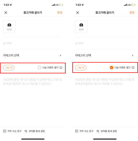 2단계 당근마켓 무료나눔 : 나눔 X 라는 글자가 뜨고 옆에 [나눔 이벤트 열기] 체크
