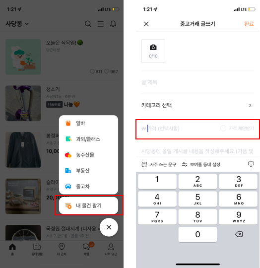 1단계 당근마켓 무료나눔 : 당근마켓 무료나눔 [내 물건 팔기]에서 가격 카테고리를 0원으로 기입