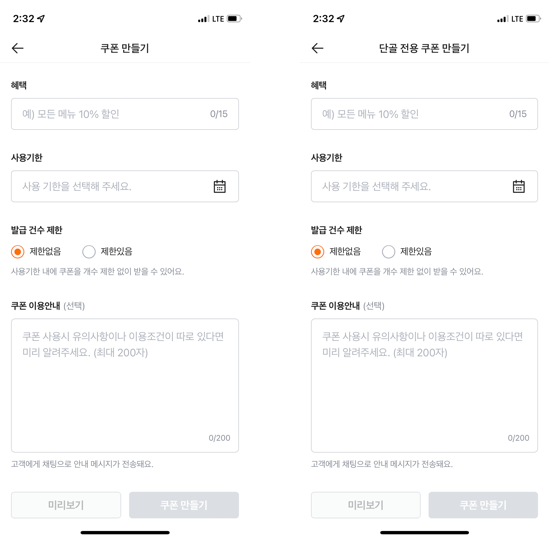 일반 쿠폰이나 단골 전용 쿠폰에 들어가는 내용은 같아요.