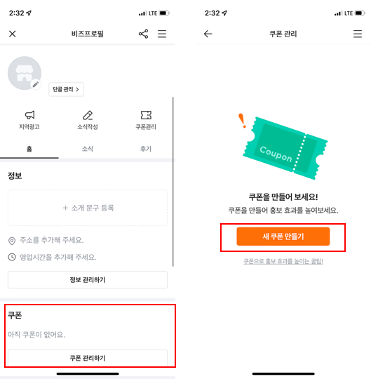 비즈프로필 같은 경우는 [쿠폰] 카테고리에 따로 쿠폰받기로 뜨고 있어요.