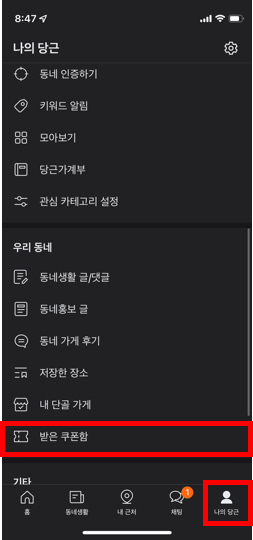 [나의 당근]으로 들어가신 후 [받은 쿠폰함]으로 가주세요.