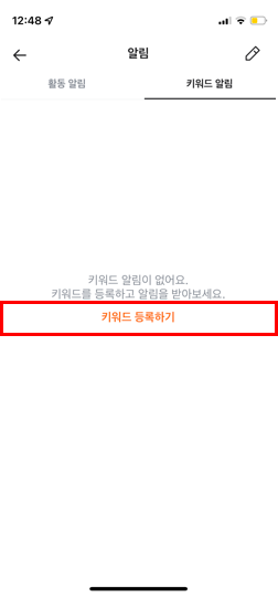 이후 다시 홈화면으로 돌아와서 [알림]버튼 클릭 후 [키워드알림]으로 가시면 자신이 등록한 키워드의 알림 확인이 가능해요.
