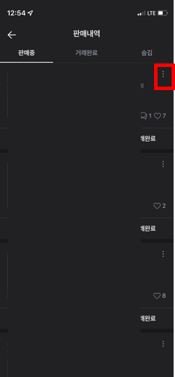 올리신 물품내역 옆에 세 번째 사진처럼 점 세 개가 보이는데 클릭해주세요.
