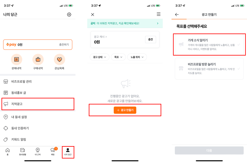 1단계 당근마켓 앱에서 [나의 당근] -> [지역광고] 클릭 (아래 사진 왼쪽 첫 번째 사진 참고)