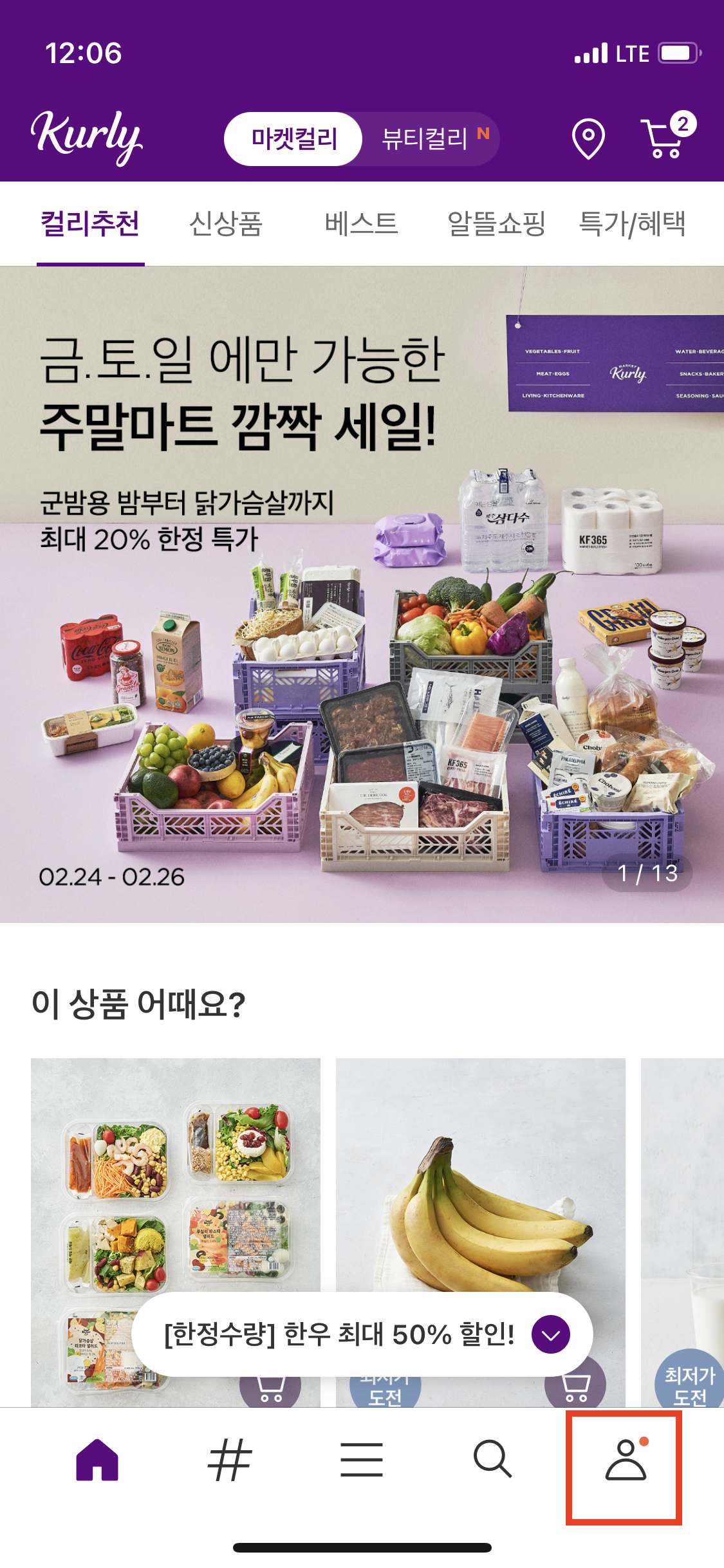 먼저 마켓컬리 앱을 켜신 후, 아래에 있는 아이콘을 눌러주세요.