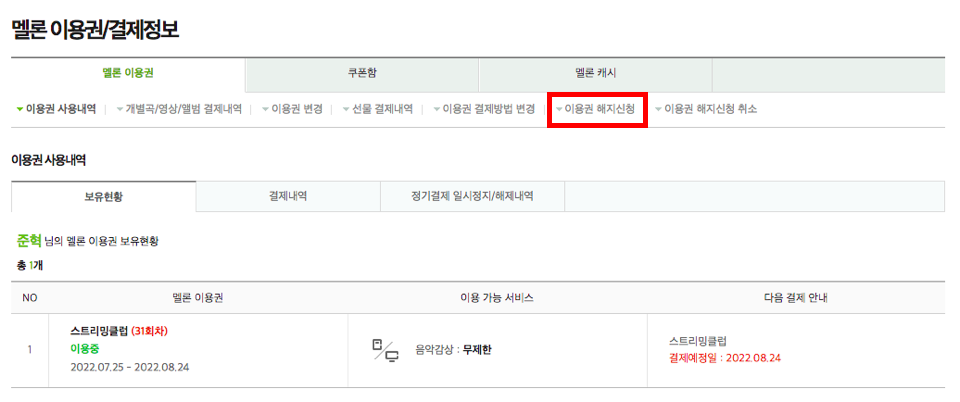 [내정보]로 들어가시면 상단에 [멜론이용권/결제정보]가 있는데 클릭해주세요.