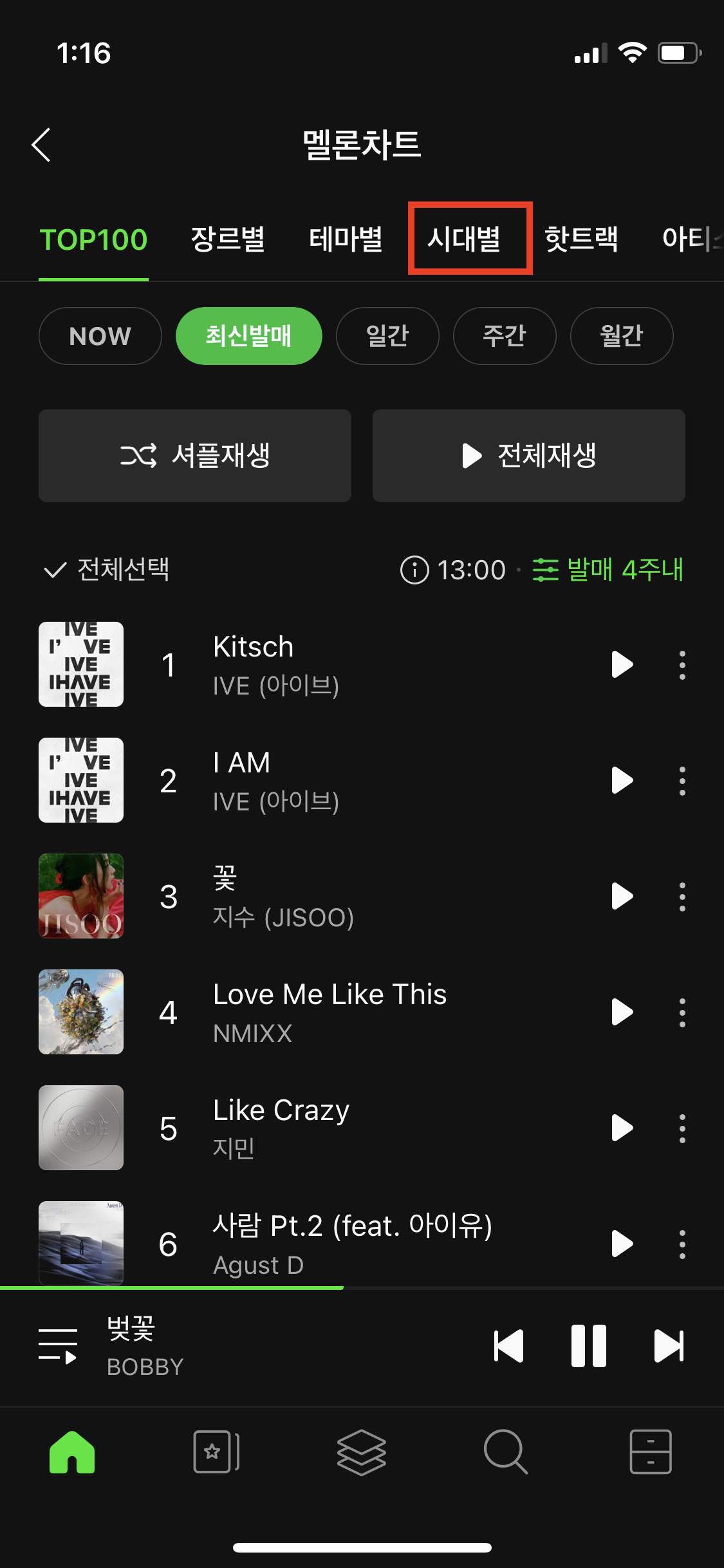 만약, 2010년대를 클릭하면 2010년대의 top100이 나오게 됩니다!