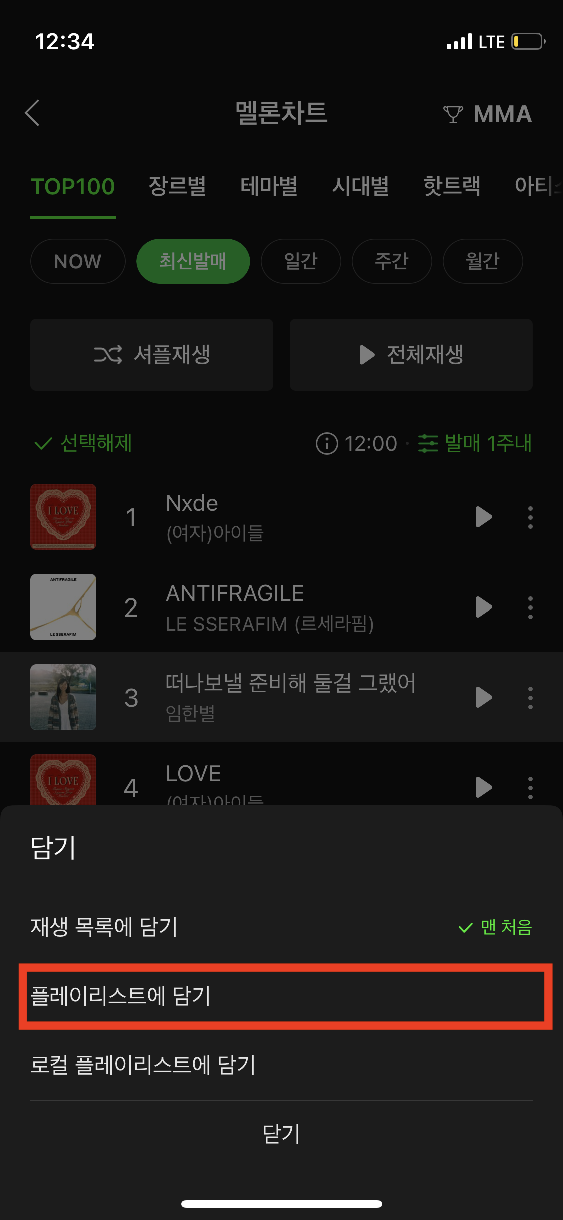 2번 항목인 [플레이리스트에 담기]를 눌러주세요.