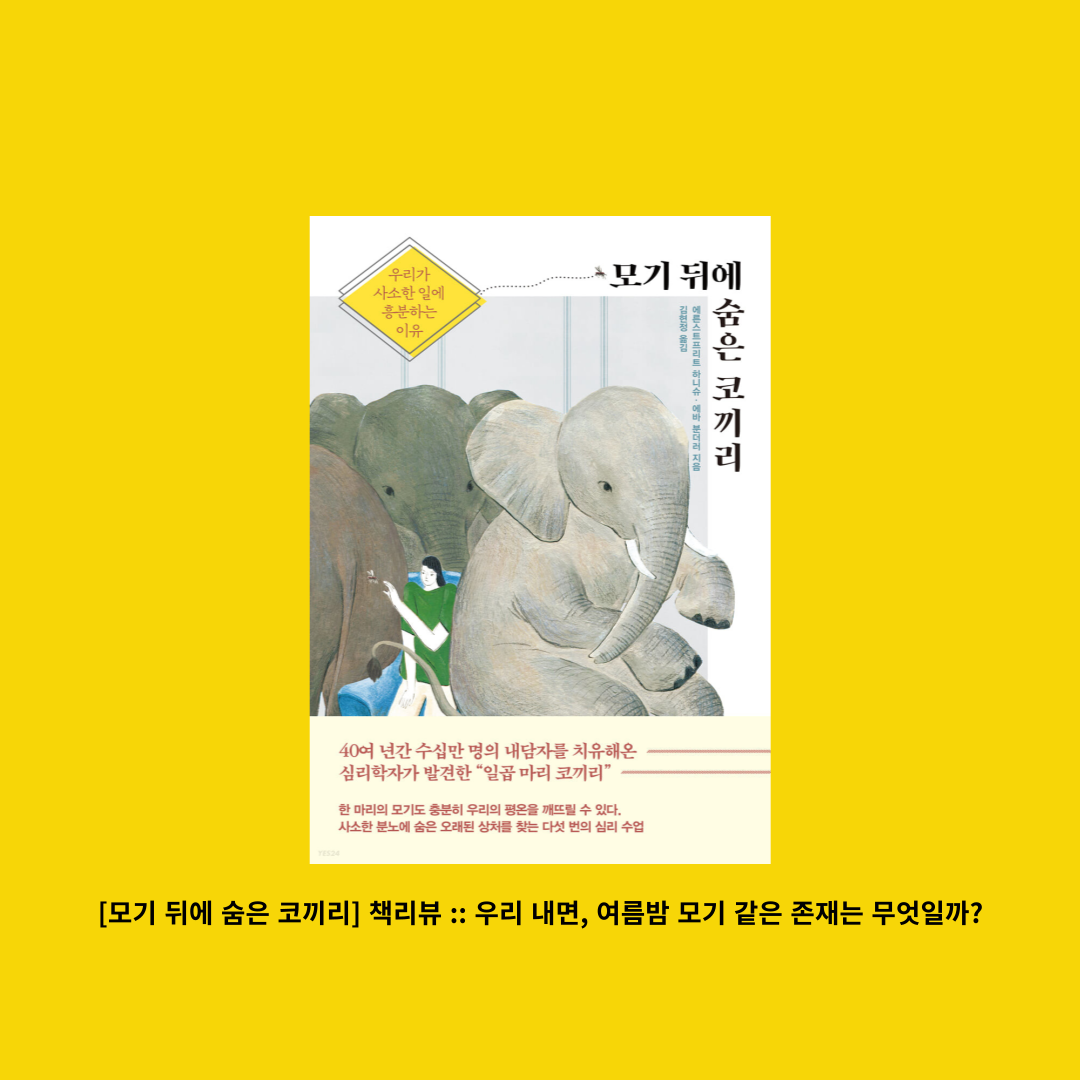 갑자기 귀에 위이잉~ 소리가 들려 온다. 잠을 자야 하는데 거슬린다. 그 작디작은 모기 한 마리 때문에 계속 신경이 쓰인다. 결국 일어나서 불을 켜고 모기를 잡을 때까지 잠을 설친다. 우리 내면에도 이처럼 작은 모기가 존재한다. 분명 작은 모기지만 우리는 코끼리라고 생각한다. 오늘 리뷰하는 책이 바로 이런 내면의 이야기를 다룬 <모기 뒤에 숨은 코끼리> 책이다.