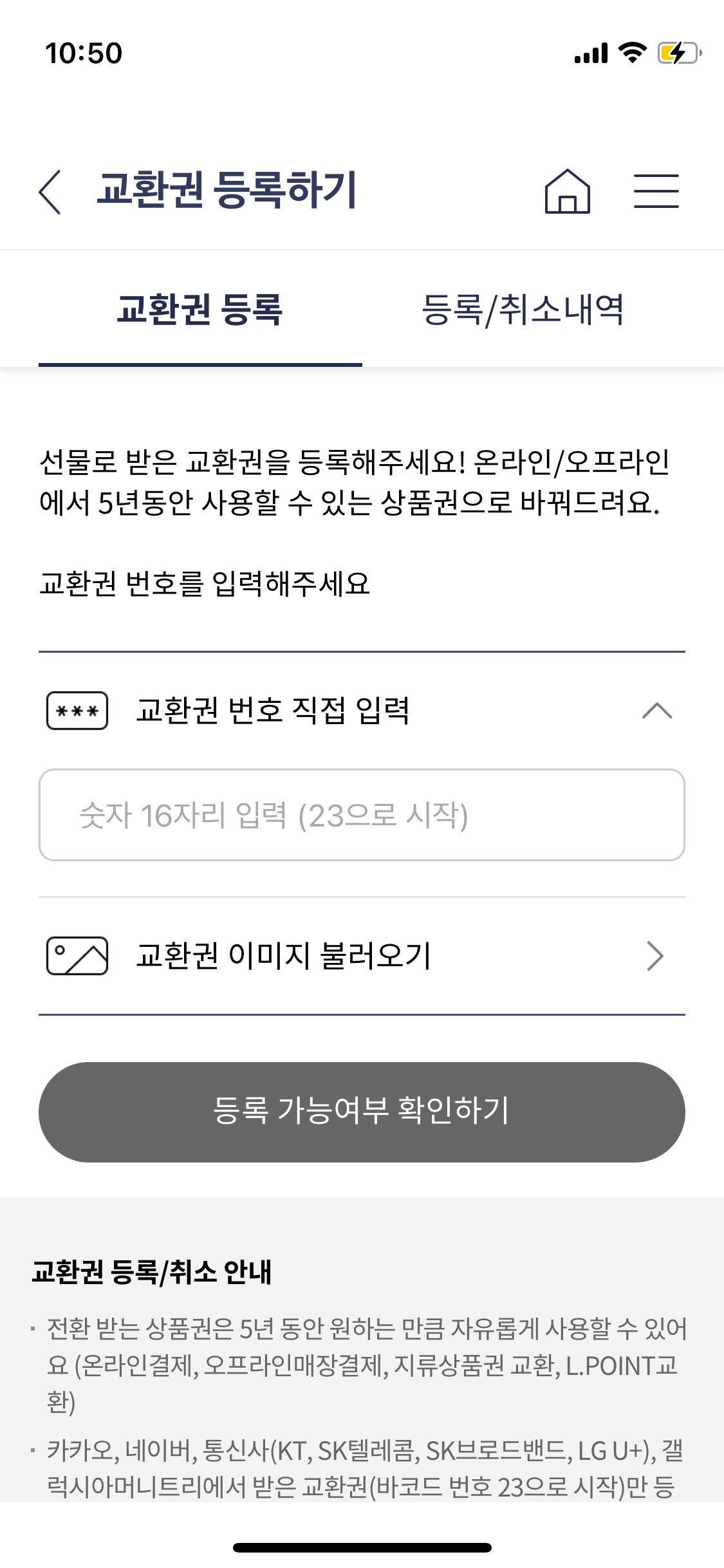 다운로드 하고 로그인을 하시면 [교환권 등록하기] 버튼이 있는데 눌러주세요
