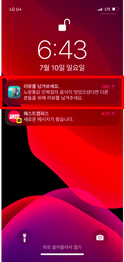 음식을 주문하고 일정 시간이 지나면 첫 번째 사진처럼 리뷰를 남겨달라는 연락이 와요.