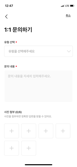 유형 선택 / 문의 내용 / 사진을 첨부하신 후, 밑으로 내려서 [문의하기] 버튼을 클릭하면