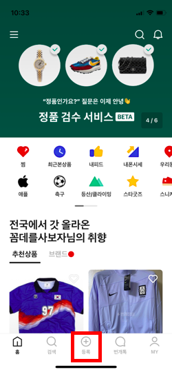 먼저 번개장터 앱을 켜주신 후 가운데에 있는 + 버튼을 클릭해주세요.