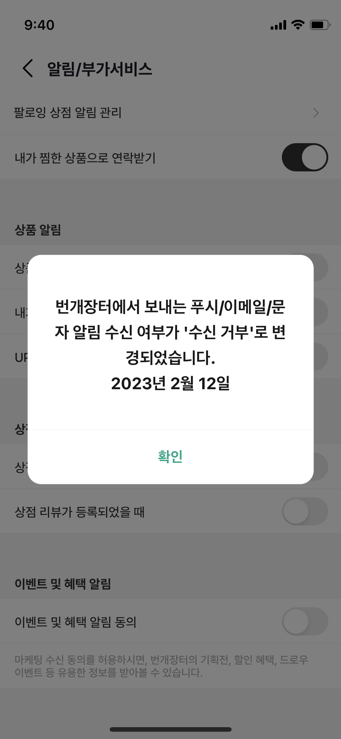 홍보 앱푸시는 맨 밑으로 내려서 비활성화 후 확인을 눌러주시면 됩니다.