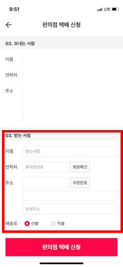 그리고 물품을 받는 사람의 이름, 전화번호, 주소, 착/선불을 선택하신 후