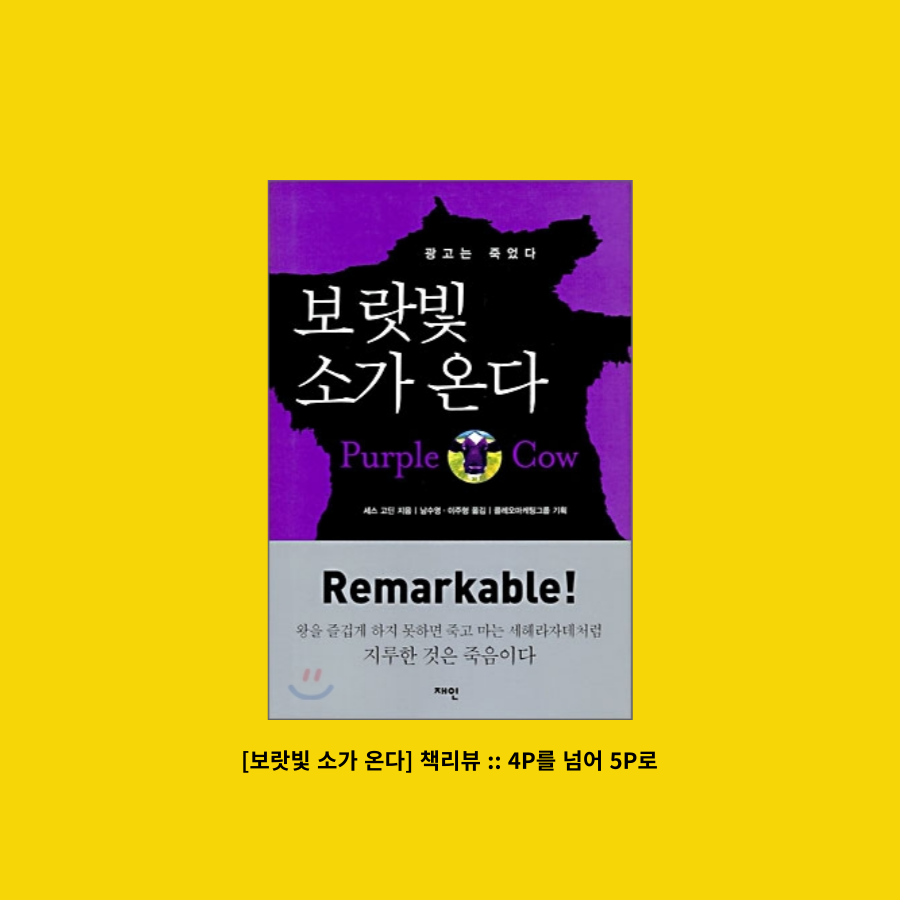 마케팅 분야 책을 말할 때 빼놓을 수 없는 사람이 있다. 세스 고딘이다. <마케팅이다> <이상한 놈들이 온다> <린치핀> 등 마케팅 분야 작가 중 독보적인 자리에 있는 저자 중 한 명이다. 그중 오늘 리뷰할 책은 <보랏빛 소가 온다>다. 보랏빛 소가 온다는 책 내용뿐만 아니라 다양한 강연과 마케팅 수업에서도 예시로 드는 소재다.
