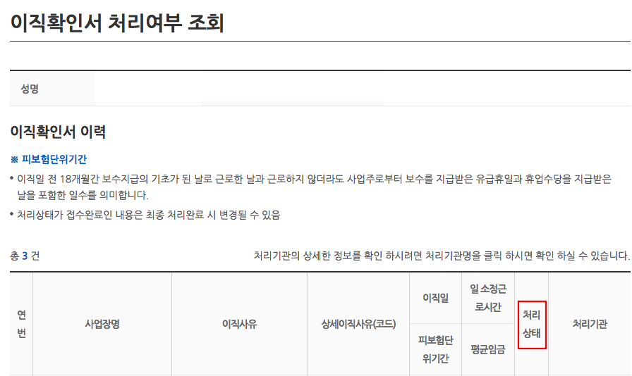그 후 [처리 상태]에 처리완료라고 뜨면 이직확인서가 완료된 거에요.
