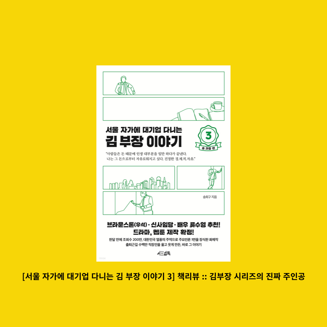 <서울 자가에 대기업 다니는 김 부장 이야기> 시리즈를 편마다 내 기준으로 간단히 정리하자면 1편에서 엄청 몰입을, 2편에서 살짝 아쉬움을 3편에서 마지막 유종의 미를 거뒀다. 2편에서 아쉬움이 느껴져서 한 권 텀을 두고 3편을 읽었다. 만약 2편에서 느낀 아쉬움 때문에 3편을 영영 읽지 않았다면 아쉬울 뻔했다.