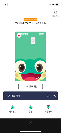 먼저 앱 첫 화면에서 [카드 신청하기]를 누르신 후 [경기도 수원시]를 클릭해주세요.