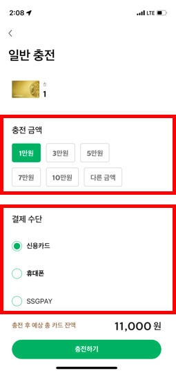 *충전은 1만원 단위로 가능하며 만약 표시된 금액 외에 다른 금액을 충전하실 거면 [다른 금액]을 눌러주세요.