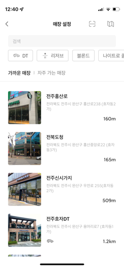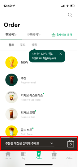 스타벅스 앱을 켠 후 [Order] - [주문할 매장 선택]을 해주세요.