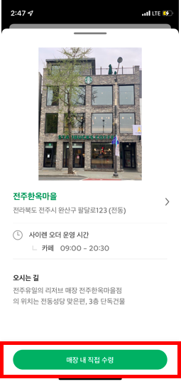2번째 사진에 보이는 [매장 내 직접 수령]을 클릭해주세요.