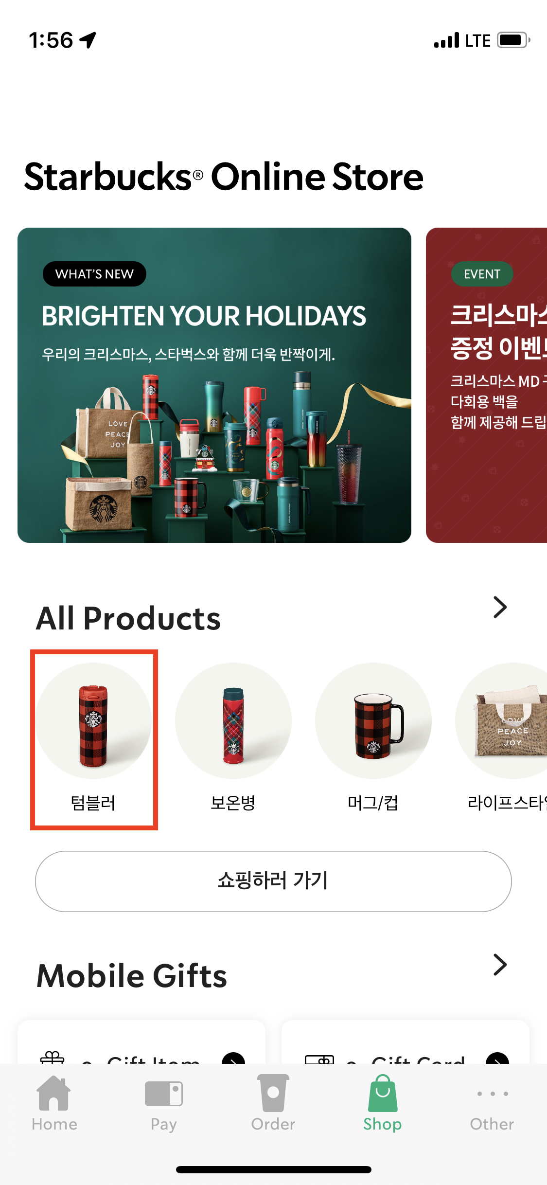 그런 다음 첫 번째 사진처럼 [쇼핑하기]를 클릭하신 후, [텀블러]를 눌러주세요.