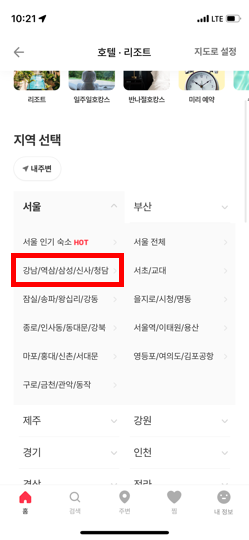 먼저 여기어때 어플을 켜주신 후, 예약을 하려는 숙소 형태를 클릭해주세요.