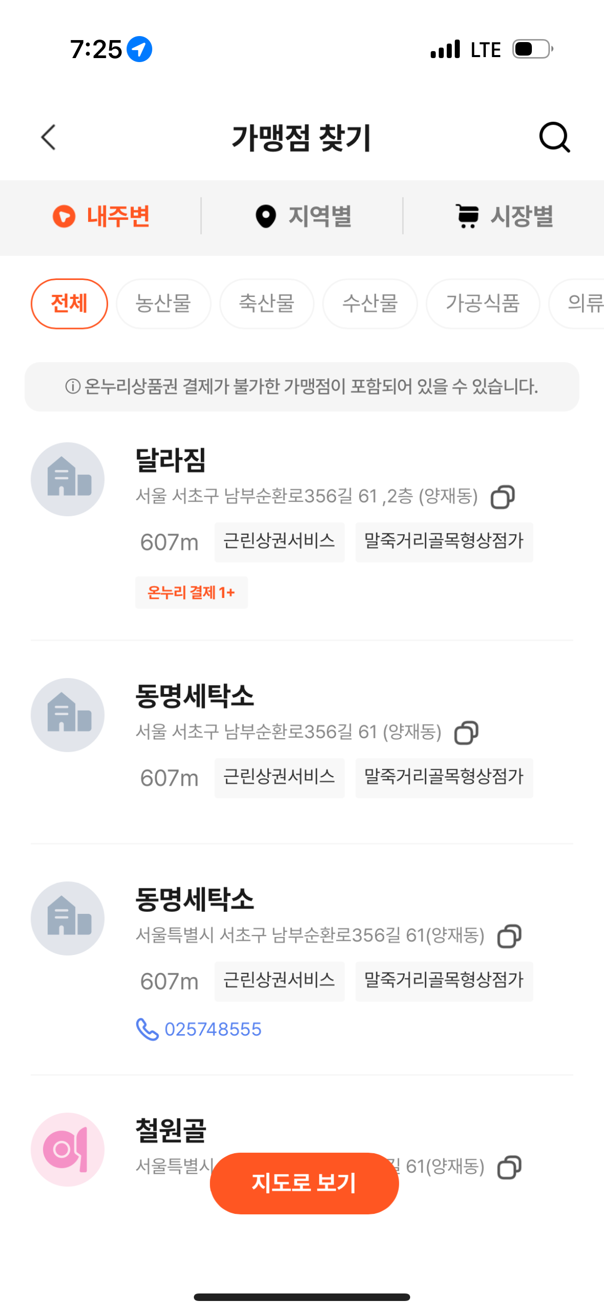 가맹점은 '가맹점찾기' 버튼을 눌러서 찾아주시면 됩니다.
