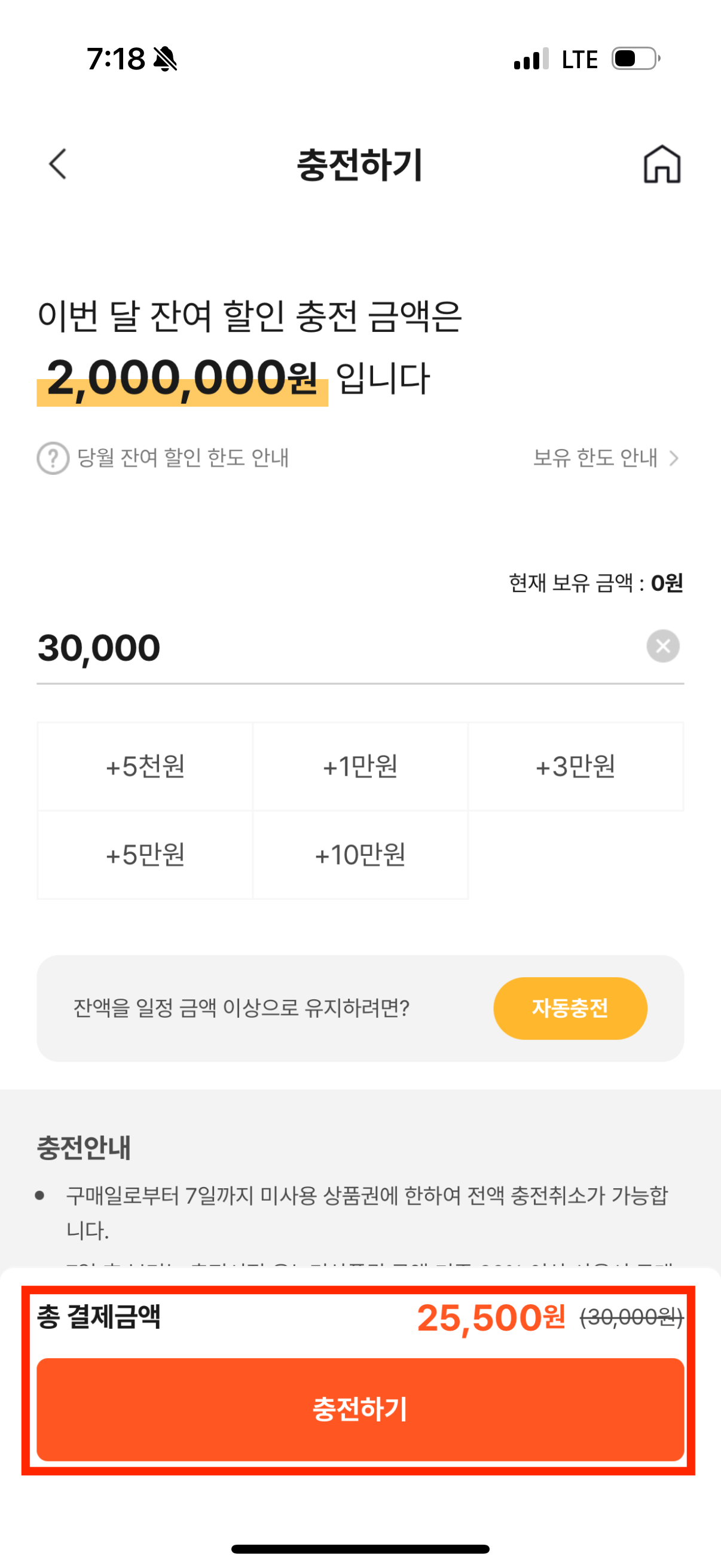 최종적으로 할인되는 금액 확인 후 '충전하기' 버튼을 눌러주시면 됩니다.