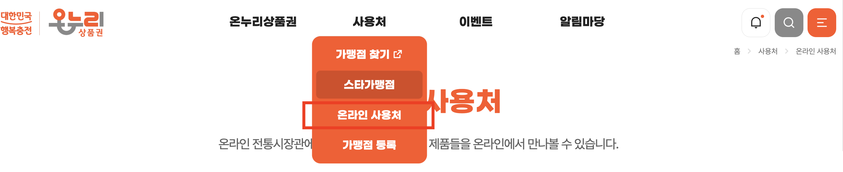 그러면 아래처럼 여러 사용처가 나오는데 여기서 '온라인사용처'를 클릭해주세요.