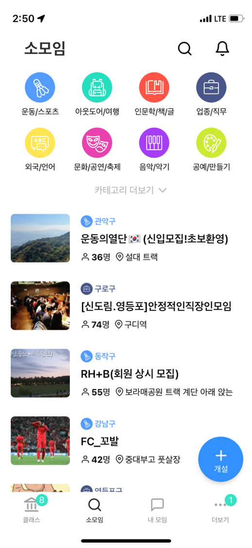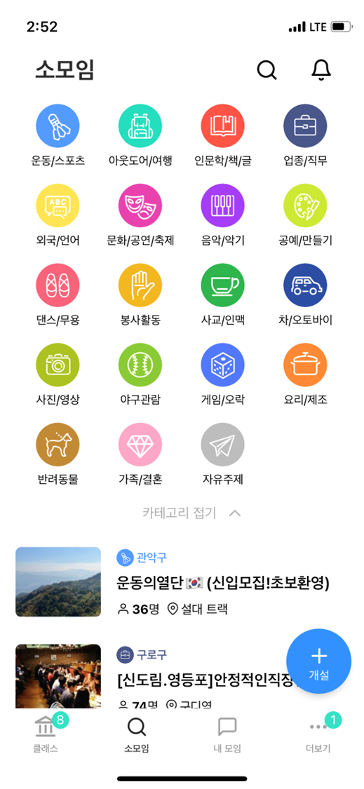 [클래스]와 마찬가지로 위에는 항목이 밑에는 다양한 동호회가 노출이 돼요.