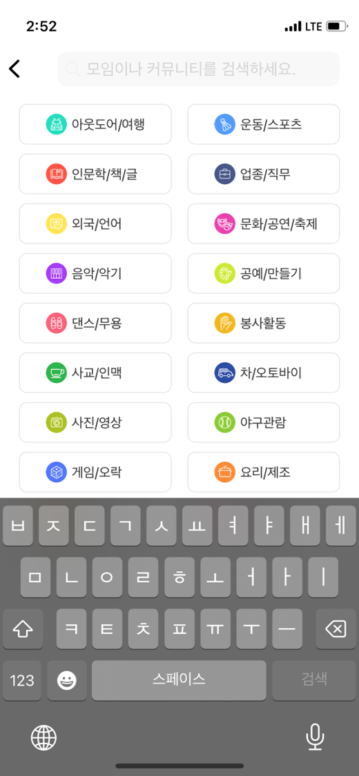 [클래스] 옆에 [소모임]을 클릭하시면 본격적인 동호회 탐색이 나옵니다.