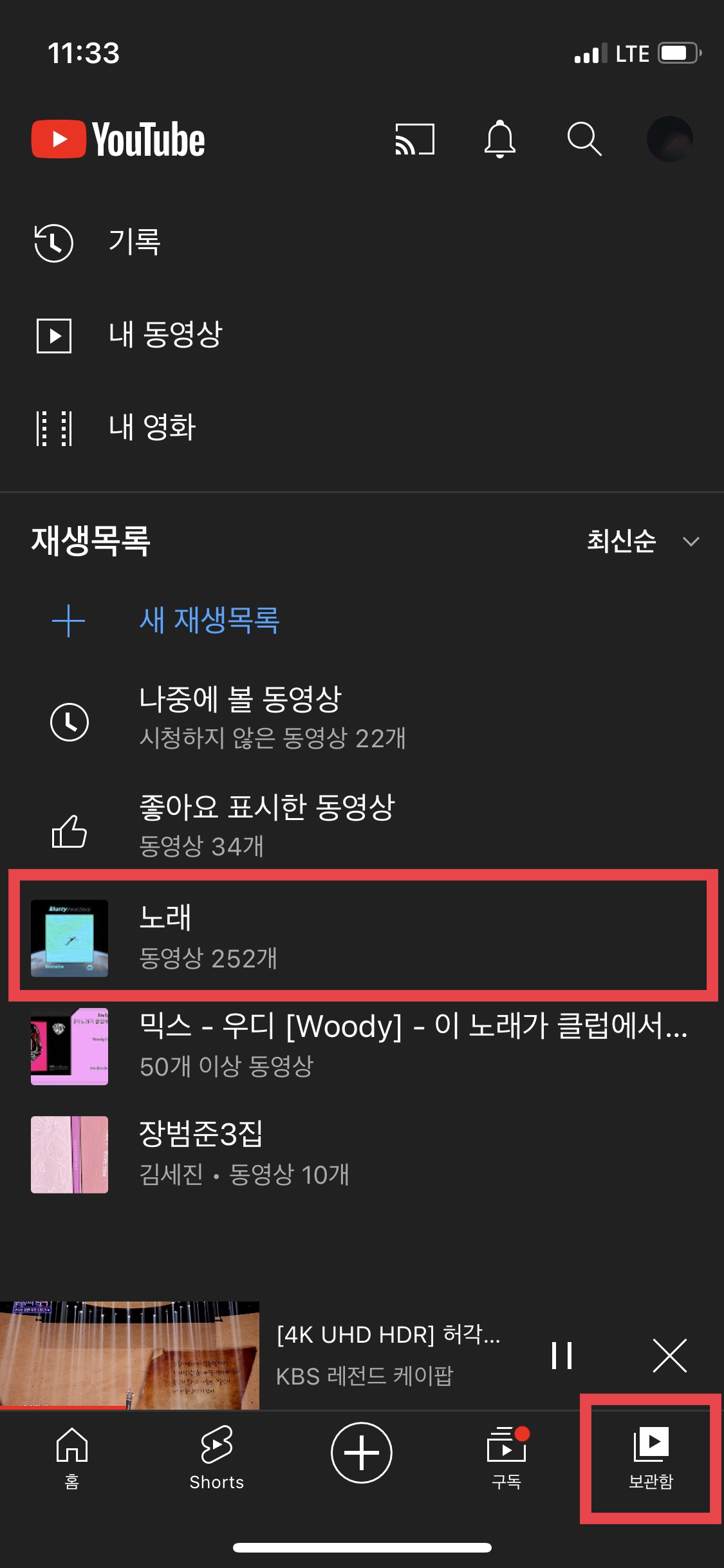 재생목록 확인은 [보관함]을 눌러주신 후, 빨간색 네모칸처럼 만들어놓은 재생목록을 눌러주세요.