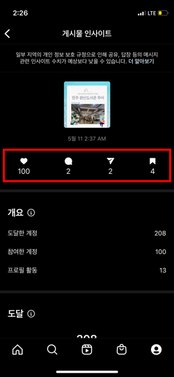 인사이트 보기로 들어가시면 아래와 같이 게시글 하나의 인사이트를 확인하실 수 있는데요.