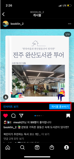 게시글 하나의 인사이트를 확인하시려면 게시글을 클릭하신 후 [인사이트 보기]를 눌러주세요.