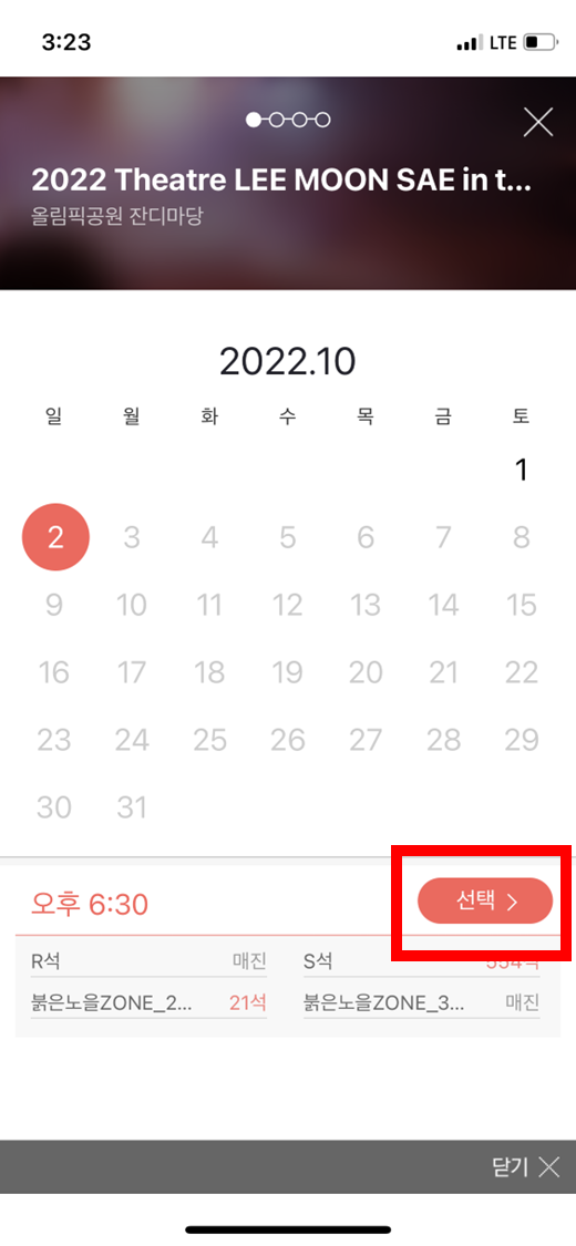 날짜 - 선택을 눌러주세요. 그런 다음 세 번째 사진처럼 [잔여좌석보기]를 눌러주세요.