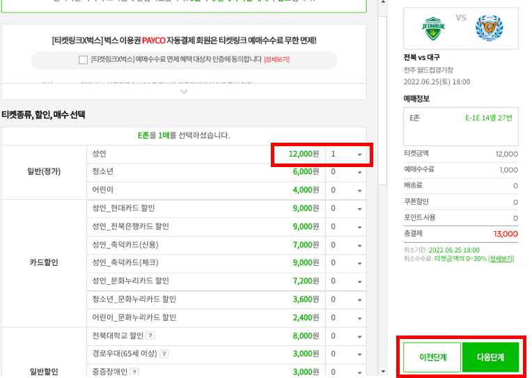 이후 성인이시라면 성인 1개를 선택해주시고 [다음단계]를 눌러주시고 결제하면 끝이납니다.