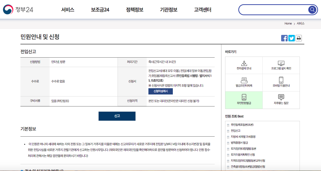 인터넷에서 전입신고를 검색하신 후 정부 24페이지로 들어와 주세요.