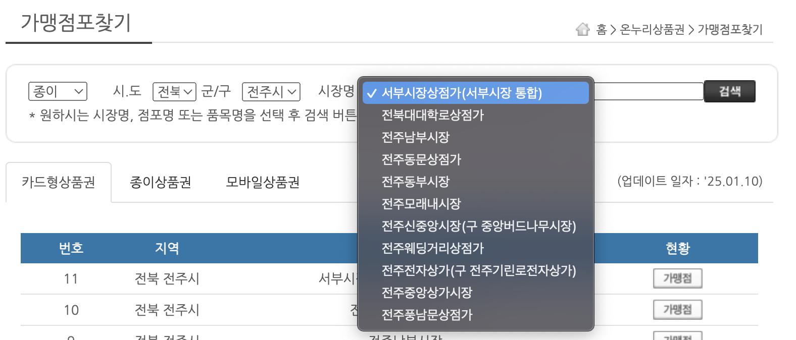 먼저 카드 or 지류를 선택하시고 전북 - 전주시로 세팅을 해주세요.